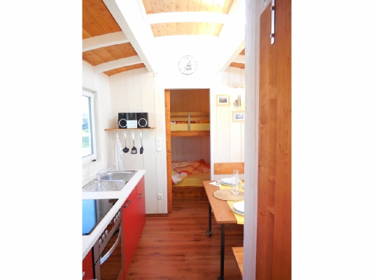 Unser Zirkuswagen bietet Platz für eine Familie mit 2 Erwachsenen und 2 Kindern (Schlafzimmer mit Doppelbett auf 2 Ebenen). Gekocht wird in der wageneigenen Küche - voll ausgestattet mit Backofen, Ceranfeld, Kaffeemaschine, Toaster, Kühlschrank mit Gefrierfach. Eine gemütliche Sitzecke mit kleinem Elektroofen bietet den passenden Platz für gemütliche Abende. Das Bad besticht durch seine großzügige Ausstattung auf kleinstem Raum!